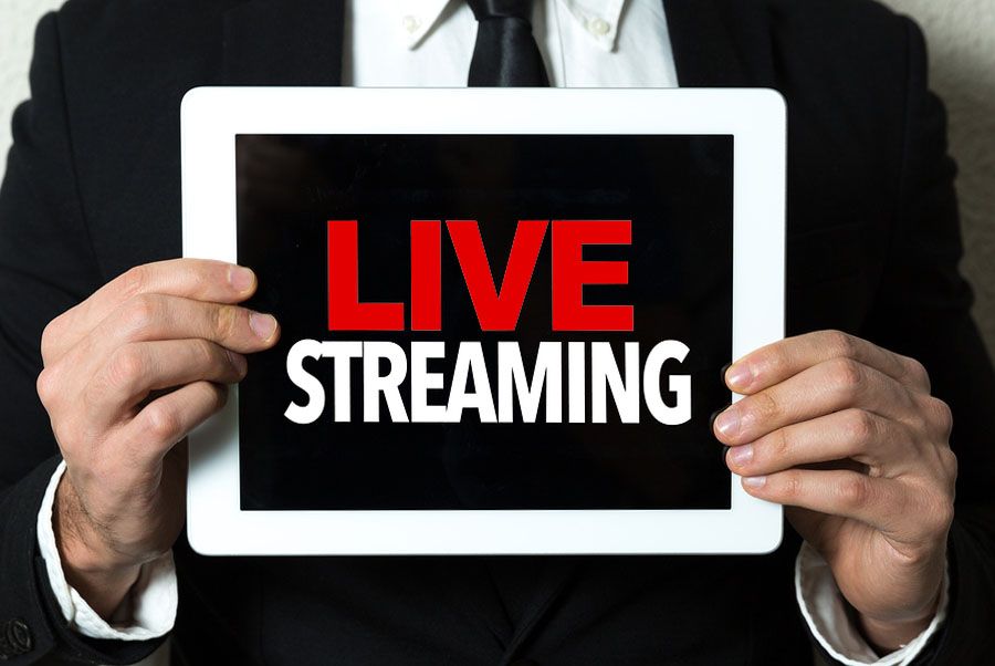 Business man holding tablet with the text: Live Streaming